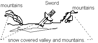 I see an enormous sword, it is as large as the mountains and it is imbedded in the fog and snow covered valley in between two mountain ranges. All I can see is the handle of sword sticking out of this white mass.
