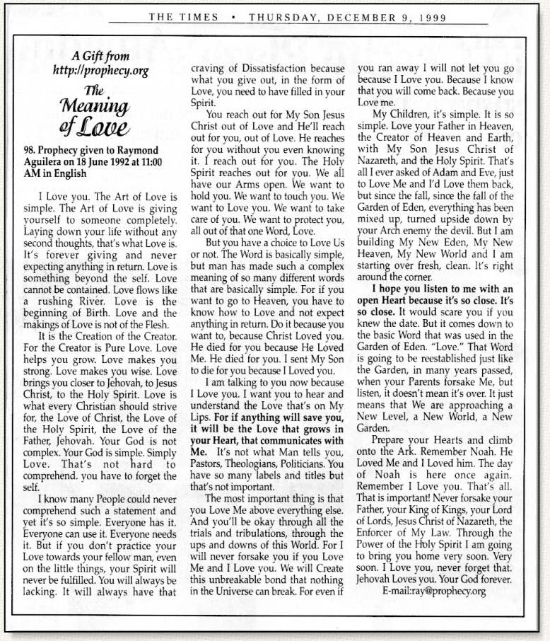 11-28-99 (E-mailed out the above news-ad "Love Prophecy" to e-mail list and churches.)